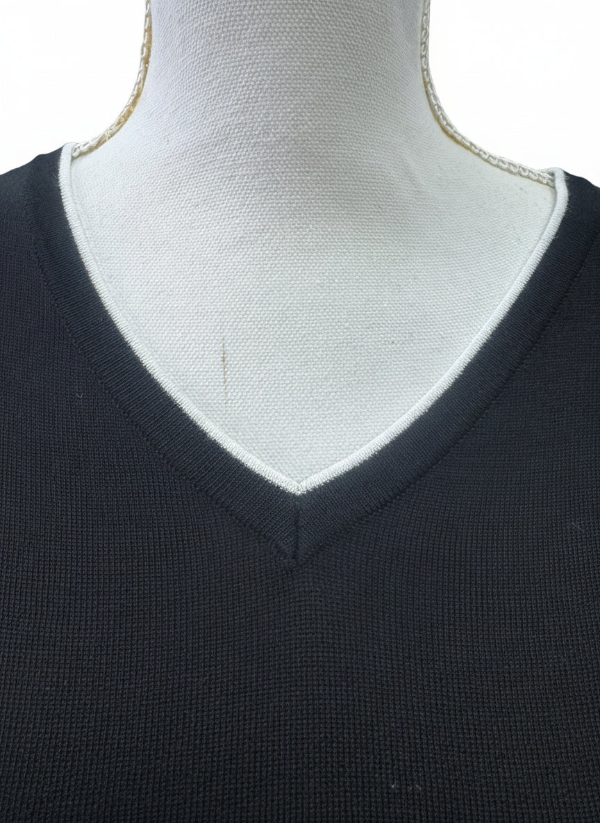 This black sweater with a white V-neckline offers a timeless, chic look with a modern twist. The classic black base provides a versatile foundation, while the contrasting white V-neckline adds visual interest and a flattering, elongating effect. Crafted for comfort and style, it pairs effortlessly with jeans, skirts, or tailored trousers, making it perfect for both casual outings and polished, everyday ensembles. Its understated elegance ensures it’s a wardrobe staple that never goes out of style.