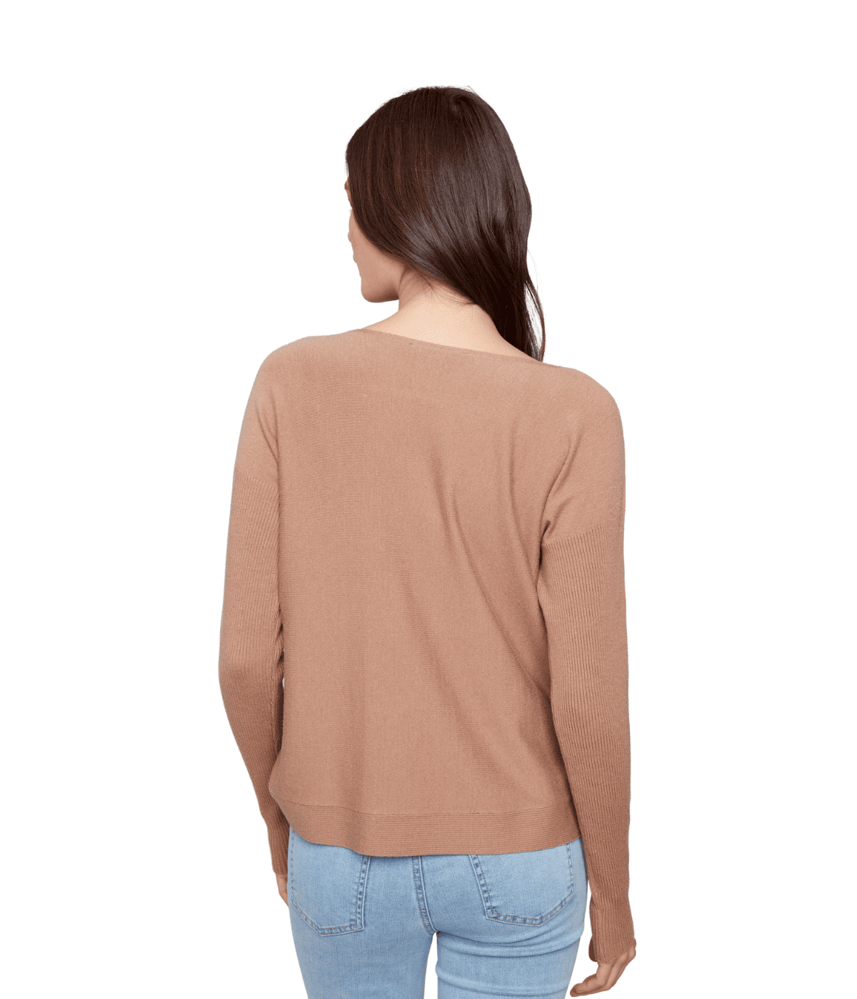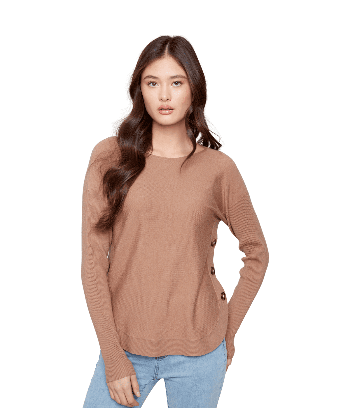 Charlie B designs a terrific essential in a lightweight knit that will give you great style and year round wear! Features include a boat neckline, ribbed sleeves and shirttail hem, and button detail down the sides of the sweater.