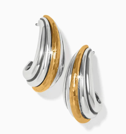 These Art Deco-inspired large hoop earrings have simplicity, symmetry and a repetition of linear elements with two-tone hammered textures against highly polished domed curves. A sculptural masterpiece.