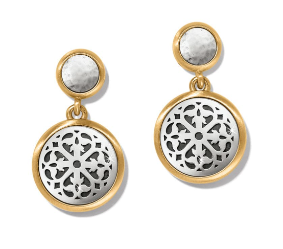 Engraved, hammered and two-tone, these earrings inspired by rose windows of 12th century European cathedrals has a handmade silversmith flair.