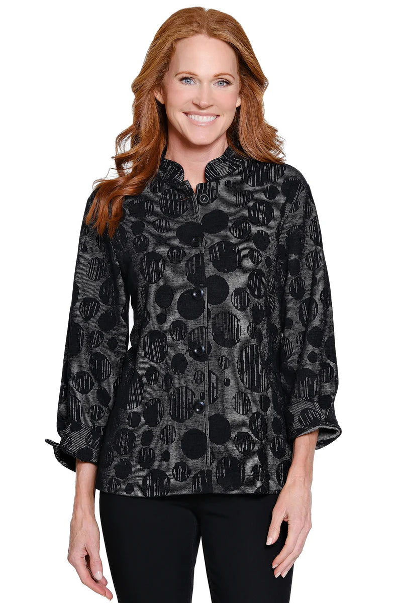 A refined take on everyday dressing, this jacquard knit tunic blends texture and sophistication. Featuring a classic point collar and button-front design, it drapes beautifully in a soft poly/rayon blend. Long sleeves and a straight hem create a polished silhouette that transitions seamlessly from work to weekend.