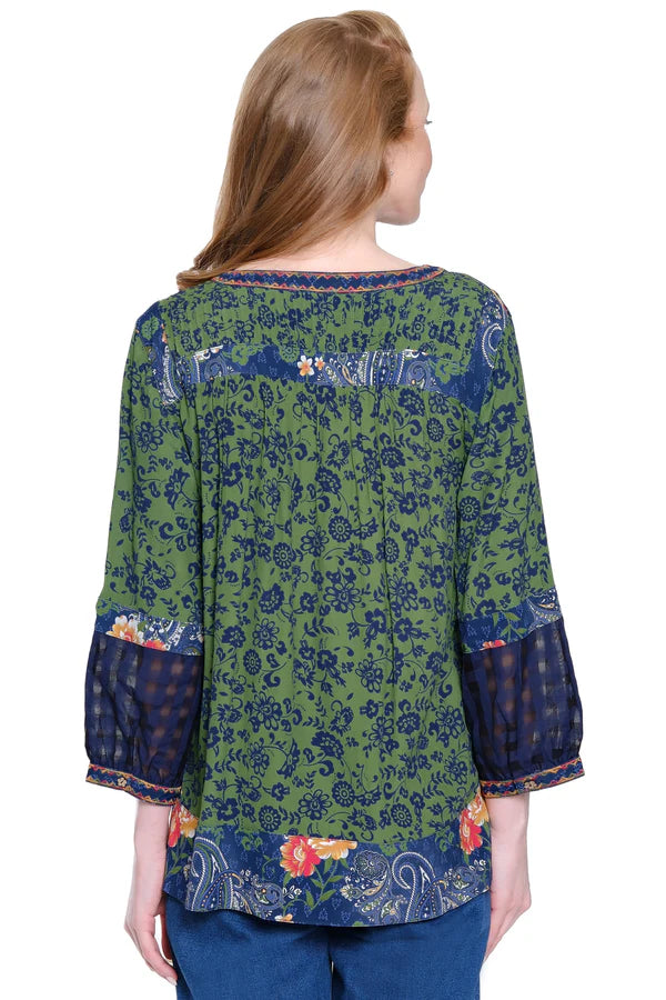 Boho charm meets everyday elegance in this peasant-style tunic. Featuring a beautifully embroidered neckline, flowing mixed prints, and relaxed 3/4 sleeves, it’s the perfect piece for breezy days and effortless style.