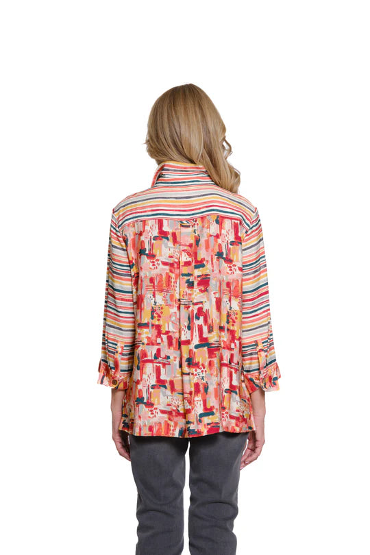 Bold meets breezy in this standout shirt, featuring a collage of prints that bring a vibrant twist to everyday dressing. With 3/4 sleeves that turn up with ease, a single chest pocket, and a relaxed woven feel, it's your go-to for effortless style with a statement.