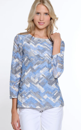 This elegant lace knit top combines feminine charm with everyday comfort. Made from a soft and stretchy polyester-spandex blend, it features a delicate printed lace design with a full lining for added coverage.