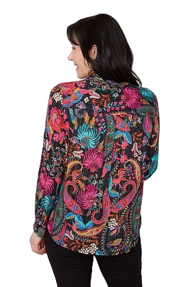 Bold, bright, and beautifully eye-catching — this Multicolor Floral Print Top is a true statement piece. Set against a sleek black background, the vibrant floral design bursts with shades of pink, orange, yellow, green, and blue, creating a lively and artistic look that instantly elevates any outfit.