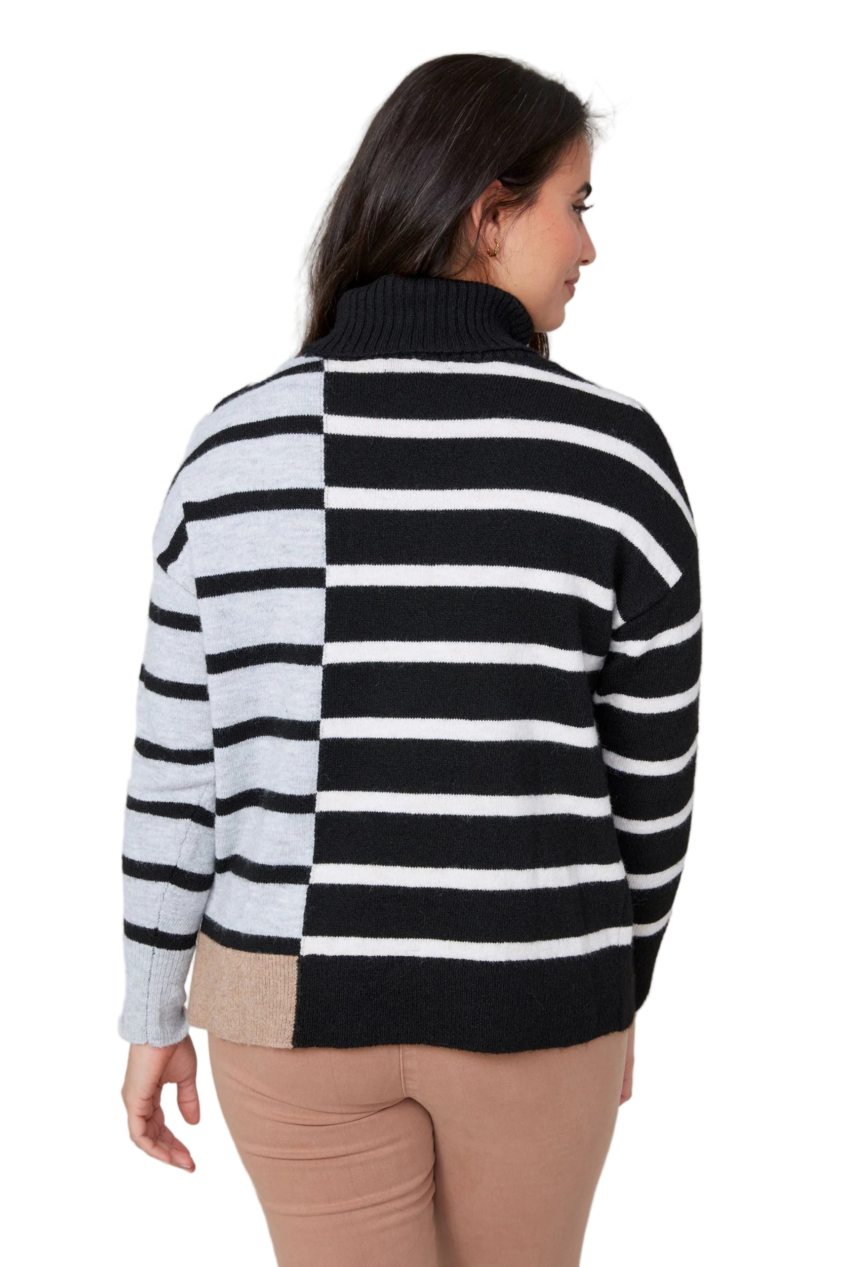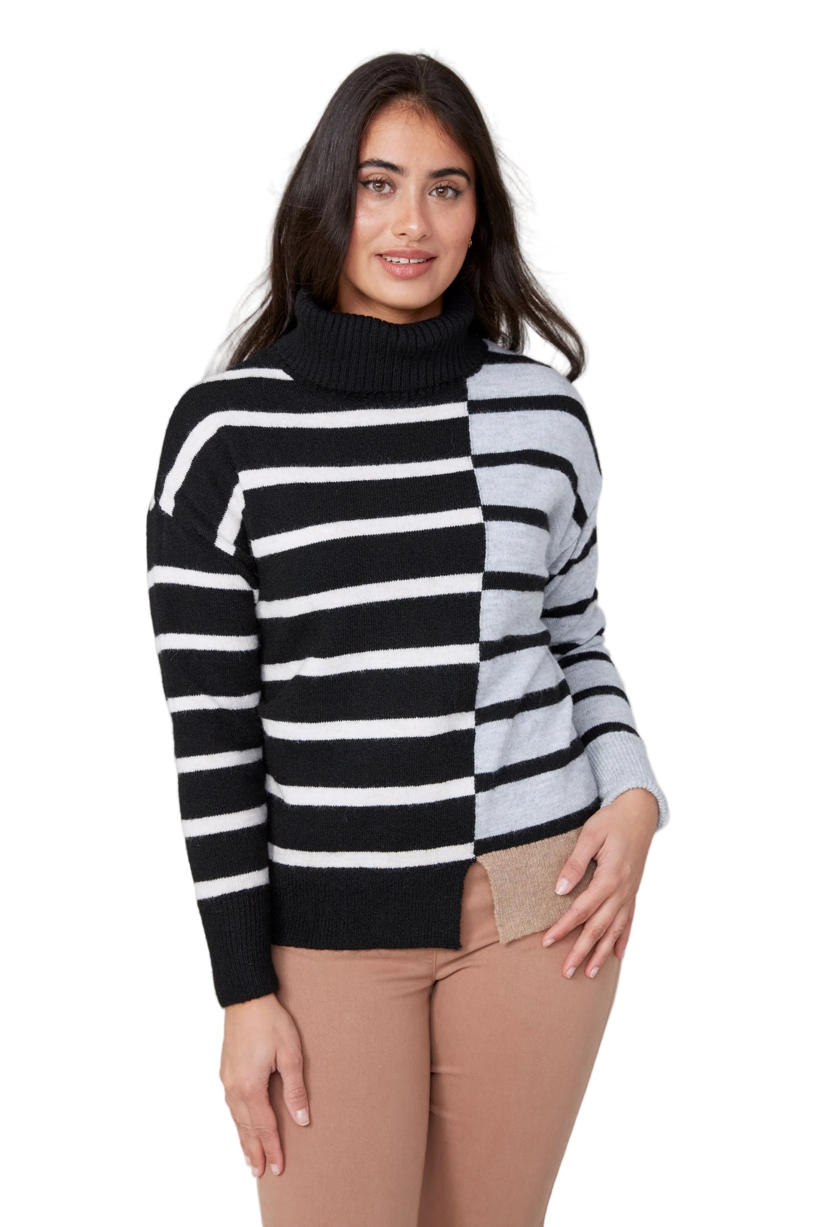 Cozy meets classic in the Renuar Striped Turtleneck Sweater, featuring a timeless black, white, and grey color palette that goes with everything. Designed with clean horizontal stripes and a relaxed fit, this soft knit sweater offers warmth without bulk — making it a perfect choice for layering or wearing on its own.