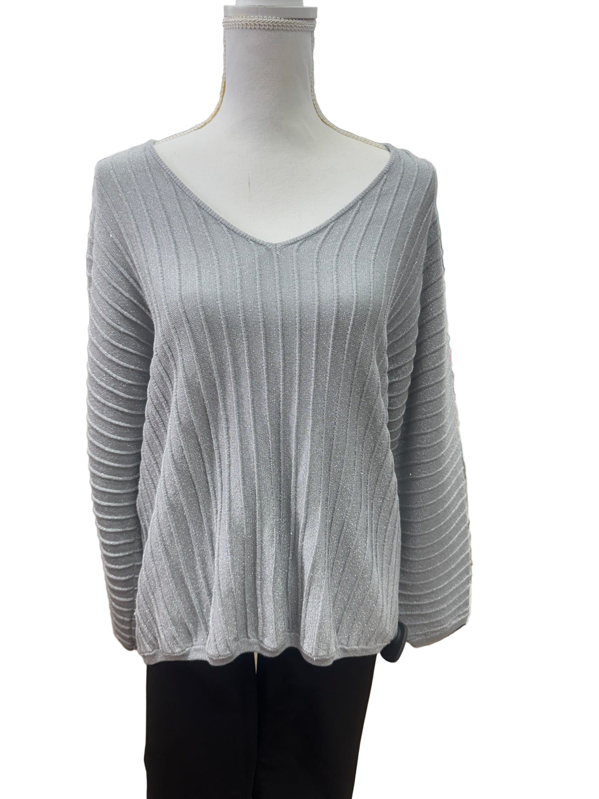 Sparkly Silver V-Neck Sweater with Rib Detail