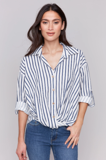 Striped Linen Blend Shirt with Front Twist Detail