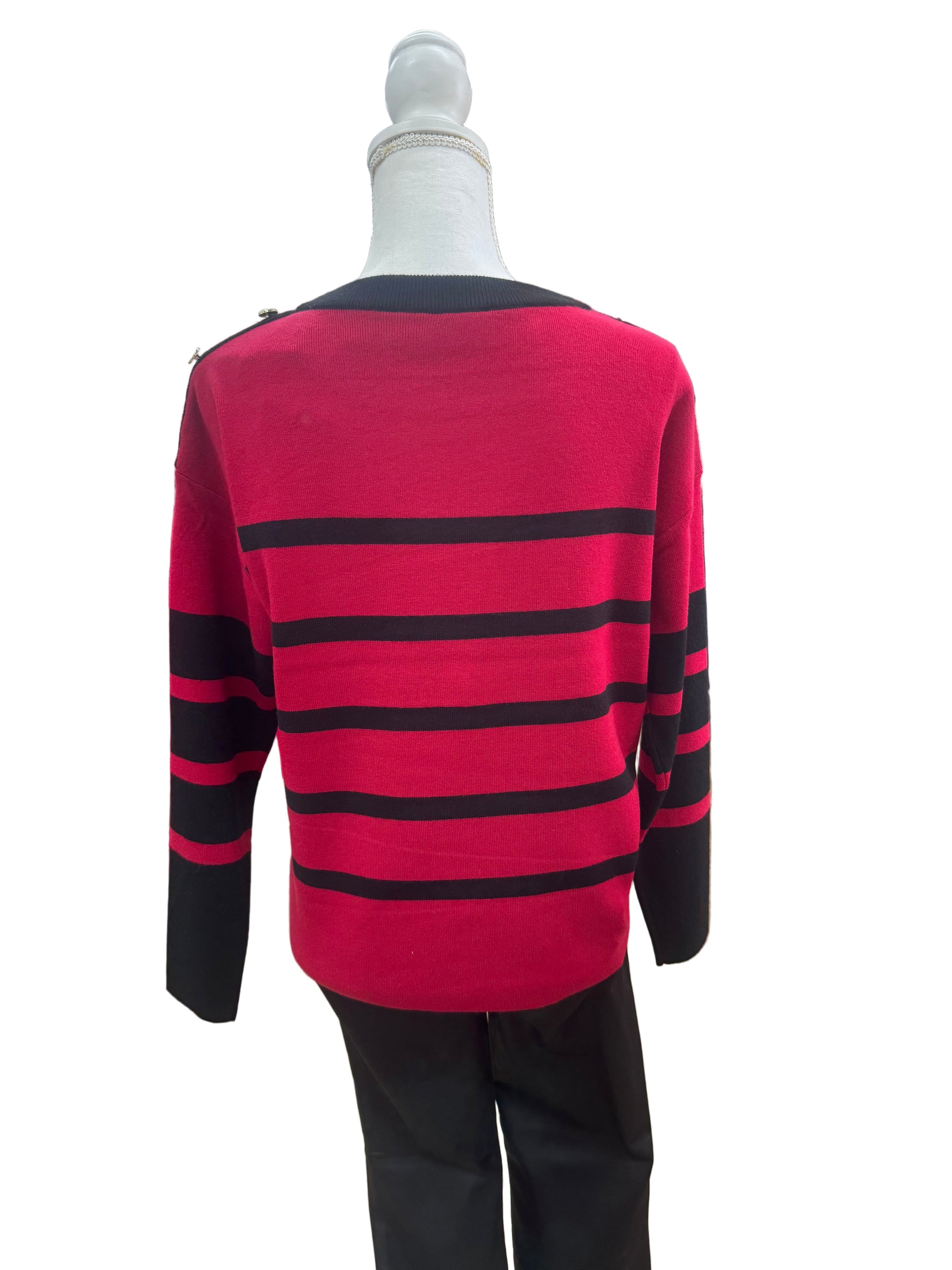 Red and Black Striped Top with Gold Button Sleeve Detail