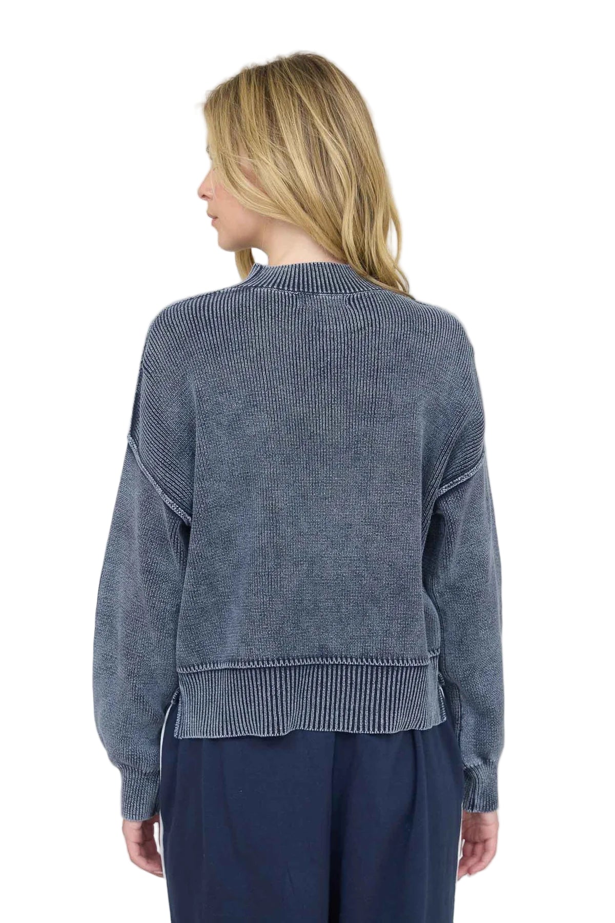 WASHED MOCK NECK LONG SLEEVE KNIT PULLOVER SWEATER - NAVY
