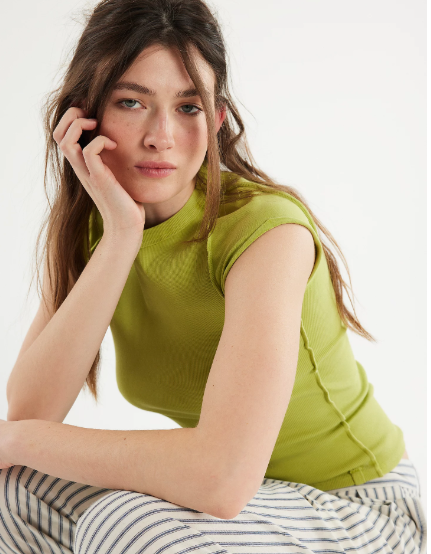 Features: Soft fabrication with a ribbed texture and stretchy feel, crew neckline, cap-inspired sleeves, raised seam detail, minimal design